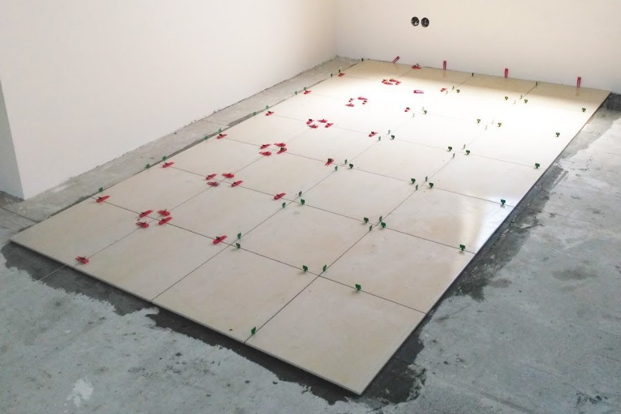 Важно следить за тем, чтобы на гранях плитки не оставался клей. Только оперативное его удаление позволит добиться эстетичного внешнего вида напольного покрытия.