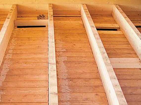 К нижнему краю лаг крепятся бруски, величиной 50х50 мм, на которые устраивают черновой пол. Он состоит из обрезков досок, на которые укладывается гидроизоляция и слой утепления. Используемым материалом служат: