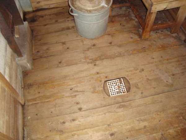 Конструкцию не протекающего деревянного пола составляют шпунтованные, плотно подогнанные доски, уложенные с незначительным уклоном в сторону водяного слива. Такое устройство обеспечивает отвод воды из помещения и ее сброс в канализационную систему или водозаборную яму. При таком устройстве вода в помещении не застаивается, и полы высыхают достаточно быстро.
