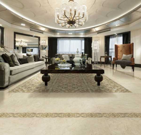 Этот дизайн пола как в гостиной, так и в других комнатах, не особо популярный вариант в России. Однако, в регионах с более теплым климатом плитка распространена.