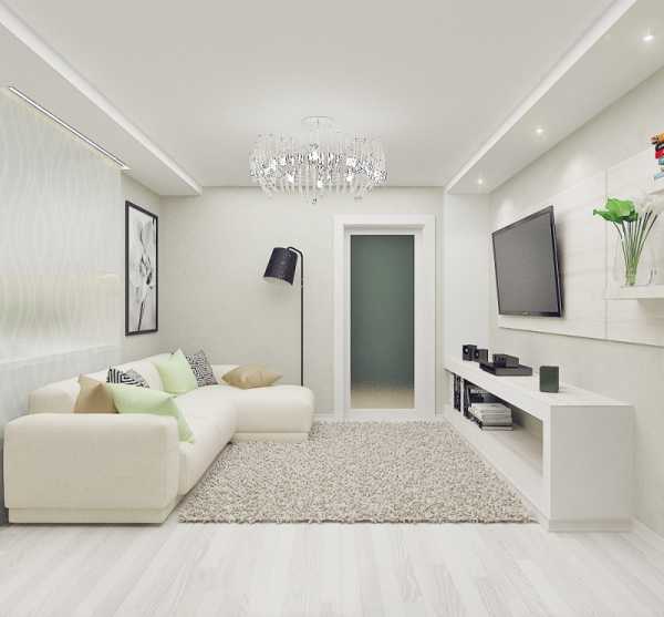 Если хочется визуально добавить высоту помещению, то белый пол отлично подойдёт. Дополнительно светлым оттенком в этом случае оформляют и потолок, а также и дальнее от входа покрытие стены.
