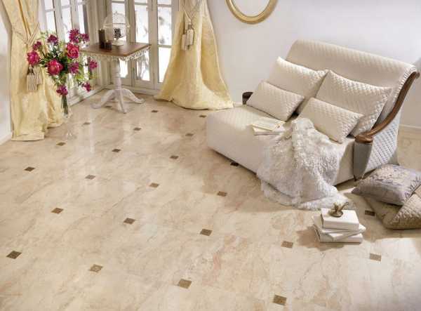 Для пола применяют плитку из гранита или мрамора. Цвет пола в гостиной может варьироваться от белого до серого и черного, от серо-розового до красного, от бежевых и коричневых тонов до зеленого цвета. Недостатки – цена и прохладная поверхность. Полы из натурального камня хорошо делать с подогревом.