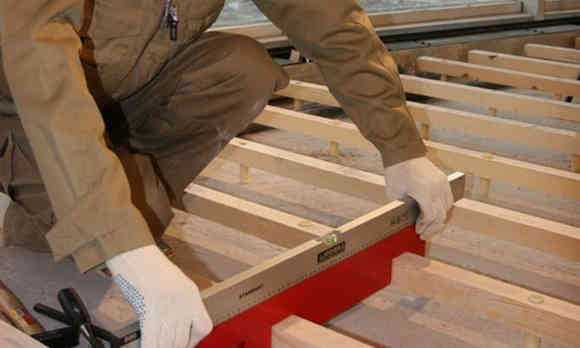 - Сверху перекладин производится укладка деревянного настила. Можно использовать шпон или обрезные доски. Стыки между планками скрепляются скобами, саморезами или гвоздями. Такой настил называют черновым полом.