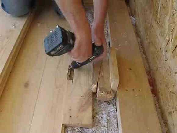 Крепить первую доску нужно, ориентируя её пазом к стене, а шипом — внутрь комнаты. Она фиксируется на своём месте гвоздиками «через тело». Крепежи располагаются так, чтобы потом они могли быть скрыты плинтусом.