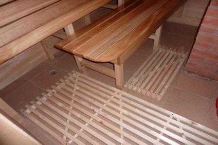 В бане используют деревянные материалы, но дерево имеет низкую теплопроводность, и теплый пол будет не эффективен. Также от высокой температуры древесина рассыхается. Практичнее уложить влагостойкий ламинат – пол будет тёплым.