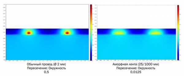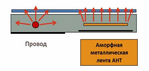 На снимке среза электрического тёплого пола в поперечной проекции, отчётливо видно, что у аморфной ленты нагрев происходит при более низкой температуре рабочего элемента, но при этом площадь гораздо больше, чем у кабеля.