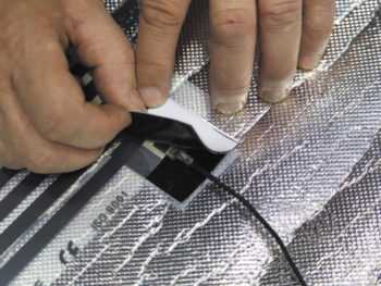 Инфракрасную пленку укладывают на фольгированный материал, крепят скотчем, а поверх настилают герметичную гидроизоляцию.