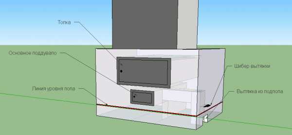 Не буду «тянуть кота за хвост», такая вытяжка создаётся устройством в печи дополнительного поддувала, которое находится ниже уровня пола, и снабжено заслонкой-шибером.