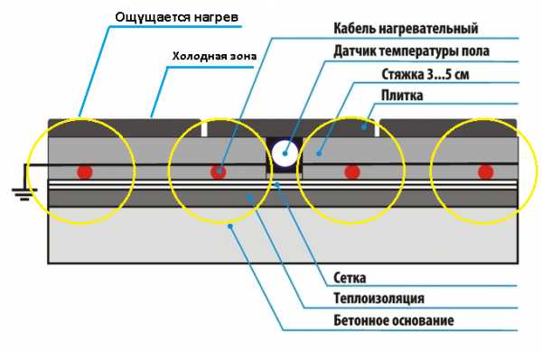 схематично показан принцип формирования эффекта «Зебры». Дело в том, что минимальное расстояние между витками кабеля — 8 см. А до поверхности пола минимум 4.5 см (3 см минимальная толщина стяжки + 1 см толщина плитки + 0.5 см толщина клеевой композиции).