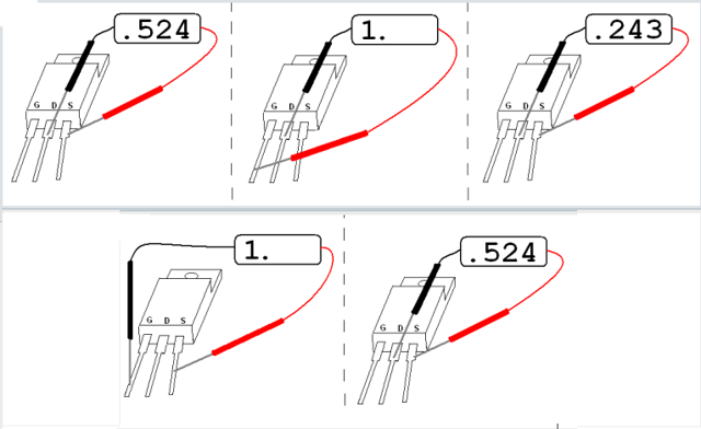 Оба мультиметра показывают проводимость (низкое сопротивление) перехода затвор-каналТем не менее, еще одна задача – это тестирование целостности канала сток-исток. Помните, как упоминалось в последнем разделе, как заряд, сохраненный емкостью PN перехода затвор-канал, может удерживать полевой транзистор в закрытом состоянии без прикладывания внешнего напряжения? Это может произойти, даже когда вы держите полевой транзистор в руке, чтобы проверить его! Следовательно, любые показания мультиметра при проверке целостности этого канала будут непредсказуемыми, так как вы точно не знаете, сохранен ли на переходе затвор-канал заряд. Конечно, если вы заранее знаете, какие выводы на устройстве являются затвором, истоком и стоком, вы можете подклюить перемычку между затвором и истоком, чтобы устранить любой сохраненный заряд, а затем без проблем приступить к проверке целостности канала исток-сток. Однако, если вы не знаете, где какой вывод, непредсказуемость соединения исток-сток может запутать вас при определении назначения выводов.