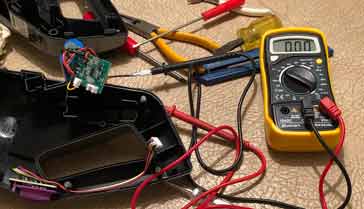 - Проверьте, нет ли обрывов проводки, которые могут помешать подаче питания на печатную плату. Со временем и движением оборудования провода могут сломаться. Одна конкретная область может быть проводом батареи — эти провода особенно подвержены повреждениям, так как необходимость их перемещения и грубая замена батареи могут привести к обрыву провода. Проверьте наличие визуальных признаков, а также используйте мультиметр в омах.