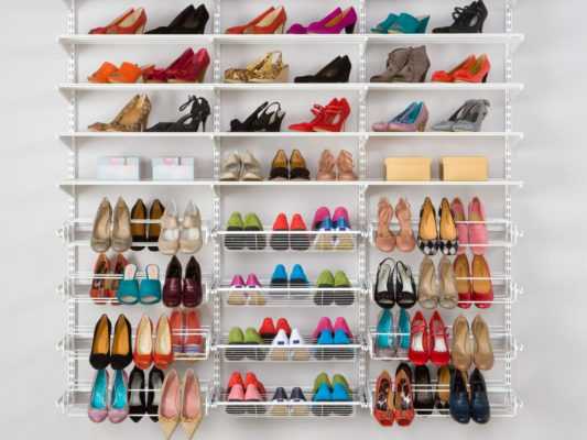 Проектирование гардеробной предполагает, что внутри будет спрятана и обувь. Ее хранят либо в коробках, либо в специальных системах. Коробки размещаются на полках, если же нет, то можно приобрести галошницы, сетчатые модули для обуви, имеющие регулированную высоту. Это поможет расставить сапоги, спортивную, сезонную и повседневную обувь.