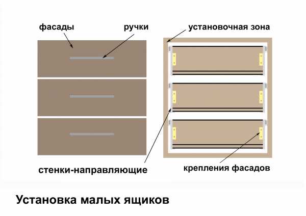 При использовании подшипниковых направляющих, они закрепляются посередине боковой стенки ящиков.