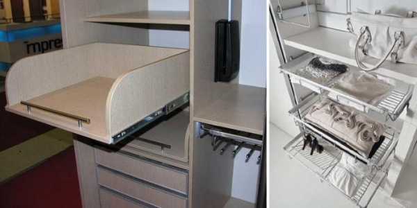 Наполнение гардеробной комнаты происходит через размещение вещей на таких внутренних модулях, как: