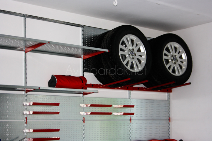 Варианты использования этой полки зависят от того, что вы собираетесь на ней хранить. Если задача — в том, чтобы сделать полки для инструмента в гараже своими руками, следуйте нашей инструкции. Если негде хранить колеса, повесьте полку вверх тормашками и ставьте их на ребро: боковые крепления, на которых держится полка, будут фиксировать и колеса.