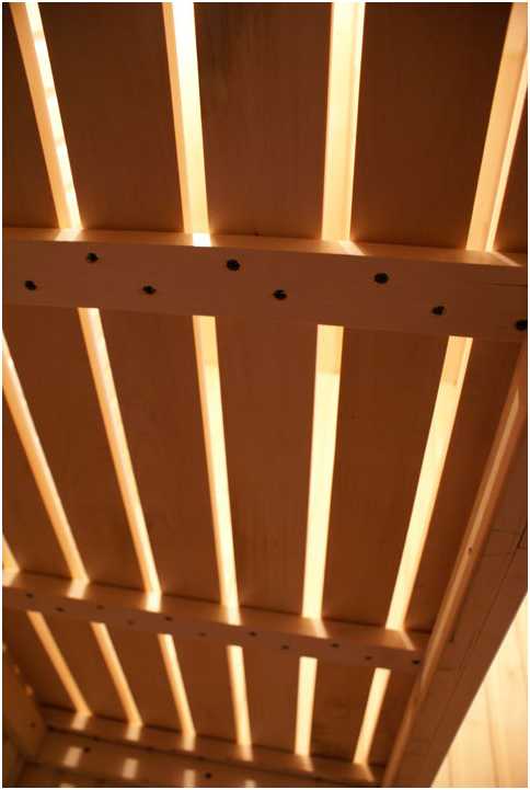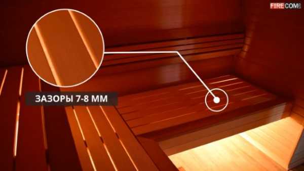 Советуем делать зазоры между полковыми досками, чтобы на полках не застаивалась вода и листья от веников. Но не делайте эти зазоры слишком большими, т.к. это может быть травмоопасно. Из нашей практики зазора в 7-8мм между досками вполне достаточно.