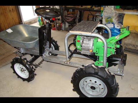 Такой самодельный трактор является одним из самых лучших, так как имеет компактные габариты и отличается высокой производительностью. Для переделки используется мотоблок, как основа, двое дополнительных колес и ось.