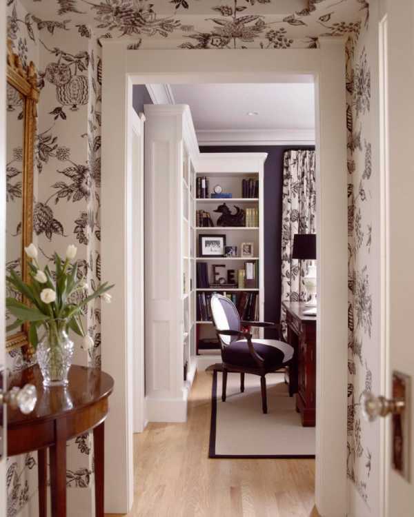 Подобный приме придаст коридору максимальный объем, поможет спрятать от любопытных глаз все недостатки и изъяны, имеющиеся на стене. Если подобрать светлые шпалеры, которые имеют контрастный мелкий рисунок, они сделают прихожую визуально более просторной, к тому же на них не будут заметны капельки пыли и грязи.