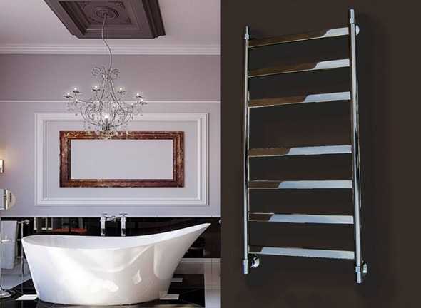 Модель лесенка очень вместительна, по сравнению с другими. Такой тип подойдет под любой дизайн ванной комнаты. Она очень мощная, а теплоотдача составляет до 2000Ватт.