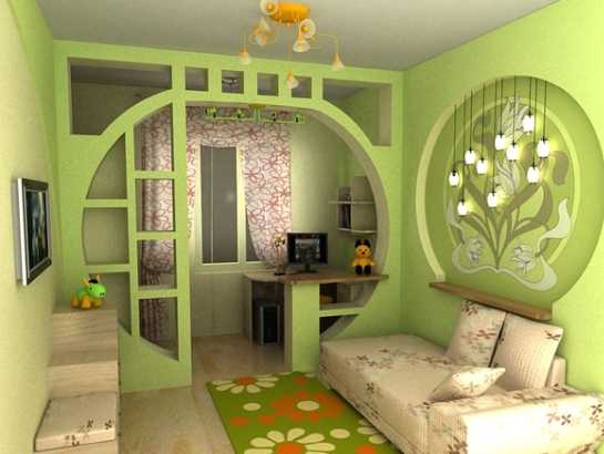 Вход в детскую комнату оформлен в виде гипсокартонной аркиДля выведения площади балкона в общую комнату, перегородка с окном остается на своем месте, видоизменяется только верх оконного проема. Вместо двери устанавливается полуарочный проём. Такой вариант является оптимальным для квартир малой квадратуры.