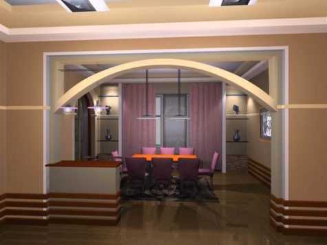Фигурная полуарка из столовой в гостинуюФигурная полуарка монтируется для создания сказочной атмосферы в детских комнатах, при совмещении балкона, лоджии со всей комнатой. Используется для разделения помещения на зоны игры, учебы и отдыха. Фигурная гипсокартонная конструкция смотрится особенно необычно, если она оснащена светодиодами, играющими роль ночника.