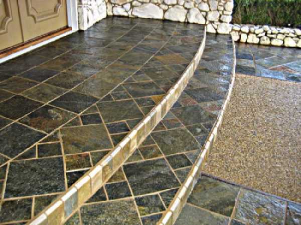 Более дешёвый вид плитки — тротуарная, так как она изготавливается из бетонного раствора. Она имеет различную форму и цвет. Можно создать интересный вариант при соединении плиток разного цвета (см. фото). Однако она не слишком долговечна и через несколько лет придется её обновлять.