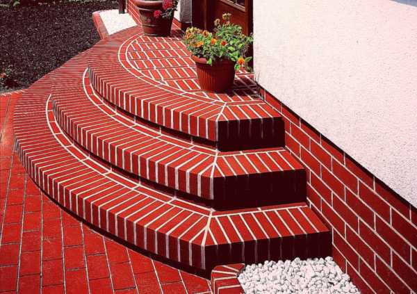 Нет более разностороннего материала для постройки ступеней, чем кирпич. Для достижения различного декоративного эффекта можно укладывать кирпич на постель желобом вниз, на ребро (ложок) или торец кирпича (тычок), что также позволит выложить ступени различной высоты. Кирпич может быть обрезанным или фигурным, и вариантов рисунка для кладки проступи очень много. Кирпич гармонично смотрится в сочетании с натуральным камнем и плиткой — в проектах ступеней можно успешно сочетать различные материалы. И что лучше всего, с кирпичом на удивление легко работать, что превращает кладку ступеней в истинное удовольствие.