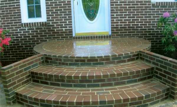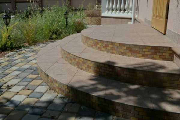 Клинкерная плитка тоже отличный вариант обустройства облицовки круглого крыльца из бетона (см. фото ниже). Эту плитку делают из глины и обжигают при высокой температуре. Она имеет высокую прочность и является самой экологически чистой, так как в отличие от керамогранита, не имеет минеральных примесей. Такой материал также имеет богатую цветовую гамму и множество форм. Из неё можно своими руками выложить оригинальную цветную мозаику.