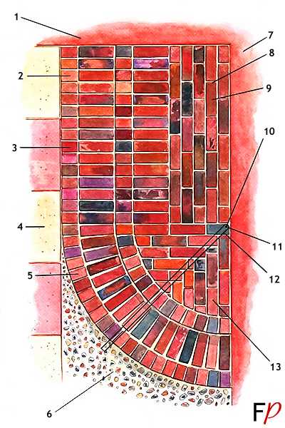Постройте внешний край нижней ступени из кирпичей, поставленных на торец. При работе пользуйтесь штангенциркулем (см. с. 37—38) и спиртовым уровнем. Заполняйте желоб раствором и укладывайте кирпич желобом вниз на слой раствора толщиной 10 мм. Между параллельными друг другу кирпичами швы должны быть шириной 10 мм, в то время как между кирпичами, расходящимися в виде лучей, ширина шва должна составлять 10 мм в самом узком месте.