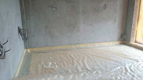 При устройстве стяжки на пленке, ее расстилают после очистки пола, а вдоль стен устанавливают демпферную ленту, которую срезают после окончания работ по устройству стяжки.