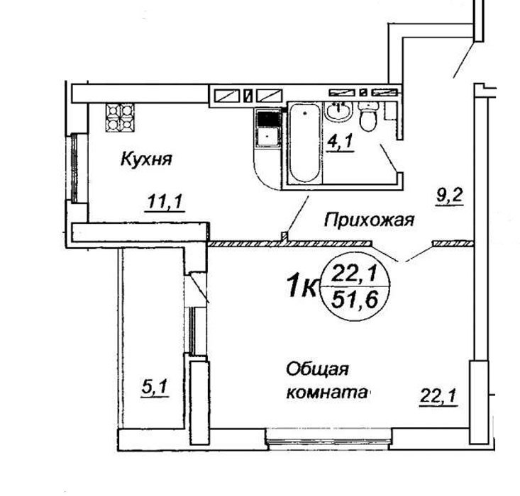 - Квартирные с комнатой и небольшой кухней. Площадь основного помещения — 12-18 метров. Размер кухни — 4-6 квадратных метров. Санузел совместный.
