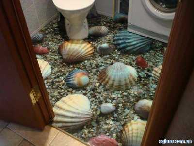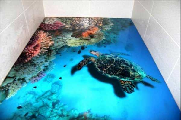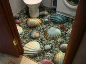 Для применения тематического изображения на полу ванной комнаты можно воспользоваться большим разнообразием готовых фотографий на водную тематику, заказать по собственным эскизам рисунок у художника или у дизайнеров, работающих по тематике «3d полы в ванной комнате». Ведь размещенное изображение нельзя будет убрать или переместить.
