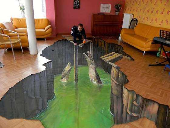 Технология 3Д полов не похожа на изготовление 3Д изображений на телевизионных экранах. В основе изготовления данного вида полов было положено творчество 3D художников. Они умеют красиво рисовать большие объемные изображения на разнообразных поверхностях. Часто такие рисунки можно встретить на асфальте в разных городах мира. Данная технология дает возможность создавать картины, которые кажутся объемными, если смотреть на них под определенным углом. Такая технология создания трехмерных рисунков была позаимствована для декорирования помещений, отсюда и появились первые 3D полы.