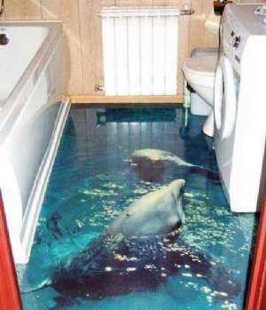 Трехмерный рисунок в туалет стоит выбирать с учетом тематической направленности – морская волна, океанический прибой, подводные животные или же иные картинки подобного формата. При этом стоит отметить что применять трехмерное изображение в туалете не очень удачный вариант. Поскольку в маленьком помещении и на маленькой площади будет теряться весь спецэффект от трехмерного рисунка.
