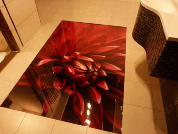 После выбора три Д изображения его размещают на подготовленную поверхность пола в ванной комнате и заливают финишным полимером с добавлением эпоксидной или метил метакриловой смолой слоем толщиной от 1,5 до 5 мм. О том, как делают заливку этого оригинального покрытия смотрите в этом видео:
