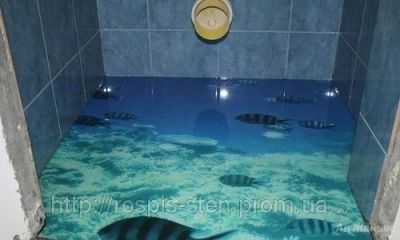 Но наиболее привлекательно выглядят полы 3d, изготовленные своими руками с применением ярких наклеек и картинок. В данном случае, в первую очередь выравнивается поверхность при помощи базового полимерного раствора. По истечении 25-30 часов, когда поверхность просохнет, на нее наносят вылаживают выбранные картинки, при этом, как правило, ее размер должен соответствовать площади заливаемой площади. После этого наклеенное изображение покрывается прозрачным раствором, при помощи которого образуется пластиковая линза, каковая в свою очередь, покрывается финишным защитным слоем. Стоит посмотреть на готовые произведения дизайнерского искусства – наливные полы 3д фото которых не оставит вас равнодушными.