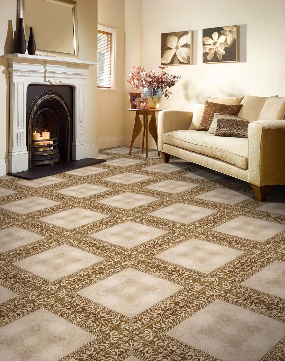 В гостиной современного дома узор «ковер» создаст более традиционную атмосферу. После устройства «теплого пола» под материалом отделки вы уже не нуждаетесь в ковре, ведь вы можете просто установить нужную температуру для пола. Из-за этого визуально образуется пустое пространство перед диваном, которое мы привыкли видеть более контрастным, декоративным и ярким. Так, керамогранит с узором справится с ролью необходимого декора в этой зоне пола.