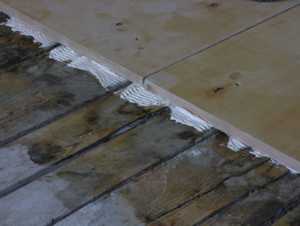 - Выньте подпорку и медленно опустите плиту на пол. Поправьте ее положение, для лучшего удаления излишков раствора немного постучите по поверхности.