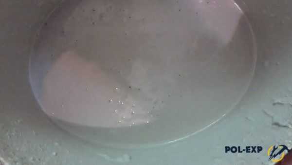 Шаг 4. Приготовьте гипсовый раствор. Марка не имеет значения, материал будет использоваться в щадящих условиях. Для приготовления гипса нужно иметь специальную емкость и миксер для дрели. В емкость всегда первой наливается вода, а только потом насыпается сухой гипс. Пропорции воды указаны производителем на упаковке, но вам нужно ее больше. Готовый раствор должен по консистенции напоминать сливки и свободно растекаться по полу.
