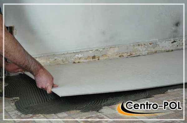 Шаг 3. Предварительно разложите листы на полу, отметьте местоположение каждого из них. Сразу вырежьте небольшие куски для полного накрывания пола у стен. Дело в том, что потом у вас не будет времени для подгонки каждого листа, гипсовая шпаклевка очень быстро схватывается. Кроме того, ходить по листам нельзя до полного застывания материала.
