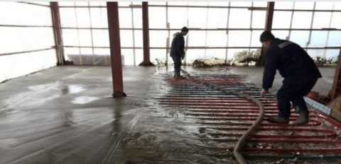 Заливка смеси происходит беспрерывно и равномерно. Для придания ровности бетонной поверхности применяют маяки, по которым и осуществляется стяжка пола. После нанесения раствора его необходимо разровнять, делают это с помощью обрезка трубы или шпателя.