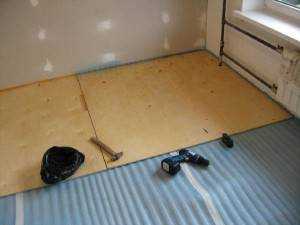 - настелить второе основание из листовых материалов — влагостойкой фанеры, листов ДСП или ГВЛ, армированных стекловолокном