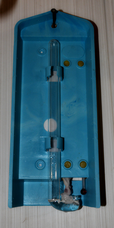 Резервуар с расширяющейся жидкостью одного из термометров обхватывает влажный фитиль, противоположный конец которого опускается в небольшой сосуд с дистиллированной водой. Этот сосуд называется питателем, сделан он из пластика и его заполняют дистиллированной (в крайних случаях кипяченой) водой.