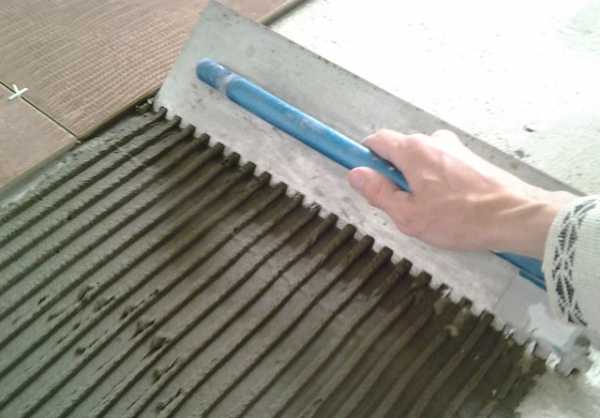 При укладке керамогранита клей наносится на основание с помощью гребенчатого шпателя