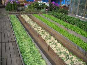 Широкое распространение в тепличных хозяйствах получило еще одно изобретение доктора Митлайдера – «высокие грядки» в деревянных коробах. Высота гряд составляет 40 см, а ширина – 45 см. Располагают их с севера на юг, оставляя широкие проходы (90 см). По мнению североамериканского ученого, именно такое расположение тепличных гряд позволяет повысить урожайность огородных культур.