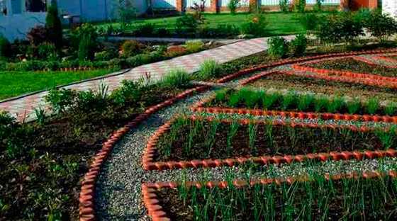 В условиях небольших участков размещать посадки в одном месте довольно сложно. Выходом из ситуации могут стать декоративные огороды, оформленные в виде цветников. Разделяющие их проходы обустраивают, используя фигурное мощение.