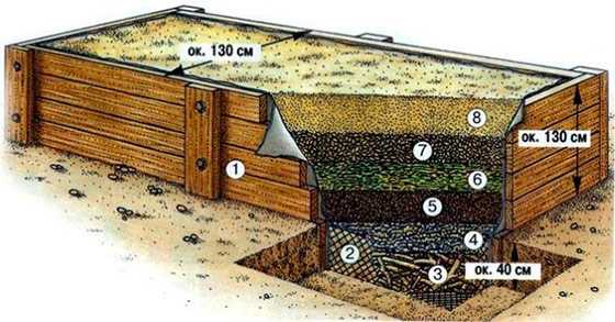 Перед началом работ необходимо решить, какой будет высота грядок. Стандартной считается высота в 20 см, но нередко грядку поднимают и до 80 см с целью прогреть почву весной как можно быстрее. Лучше всего здесь растут томаты, огурцы, кабачки, арбузы и тыква. Правда, поливать такую грядку надо чаще. Для полива можно проложить дырявый старый шланг вокруг растений.