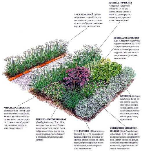 В самом центре грядке можно высадить периллу, а спереди и сзади – лук-резанец. Все пустое место, которое осталось, засаживаем фиалкой.