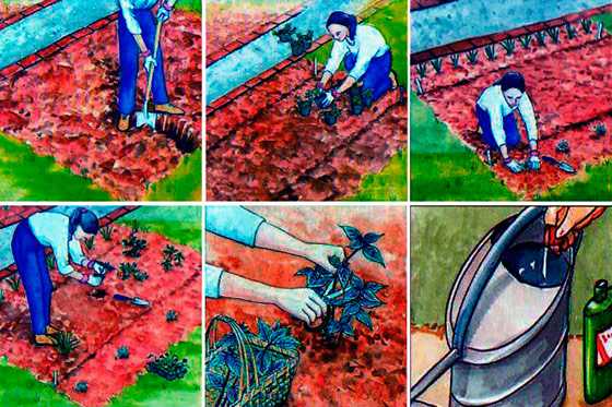 Грядка будет у нас 1,5х1,5м. Вскапываем примерно на 0,5 метра и удобряем, а после начнем высаживать растения: на расстоянии 0,3м друг от друга 3 душицы и 3 базилика, при этом от края грядки также отступите, чтобы было место для декоративного обрамления: по самому краю – клубневый лук, а за ним – сантолину.