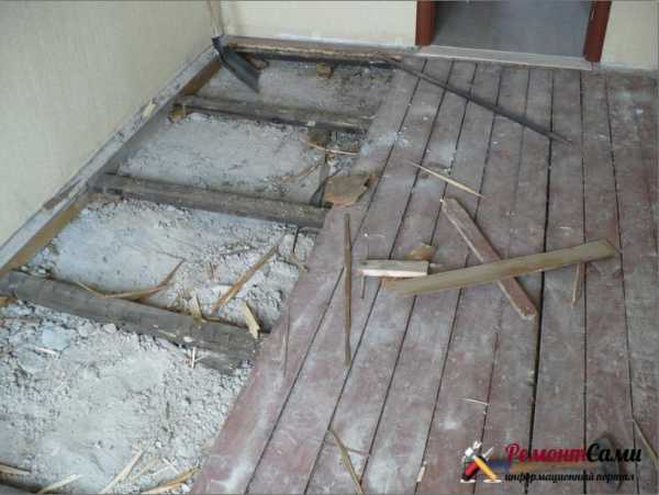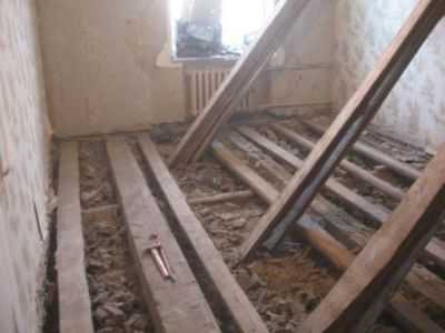 - демонтируйте старый деревянный пол. Полностью уберите половицы и лаги;